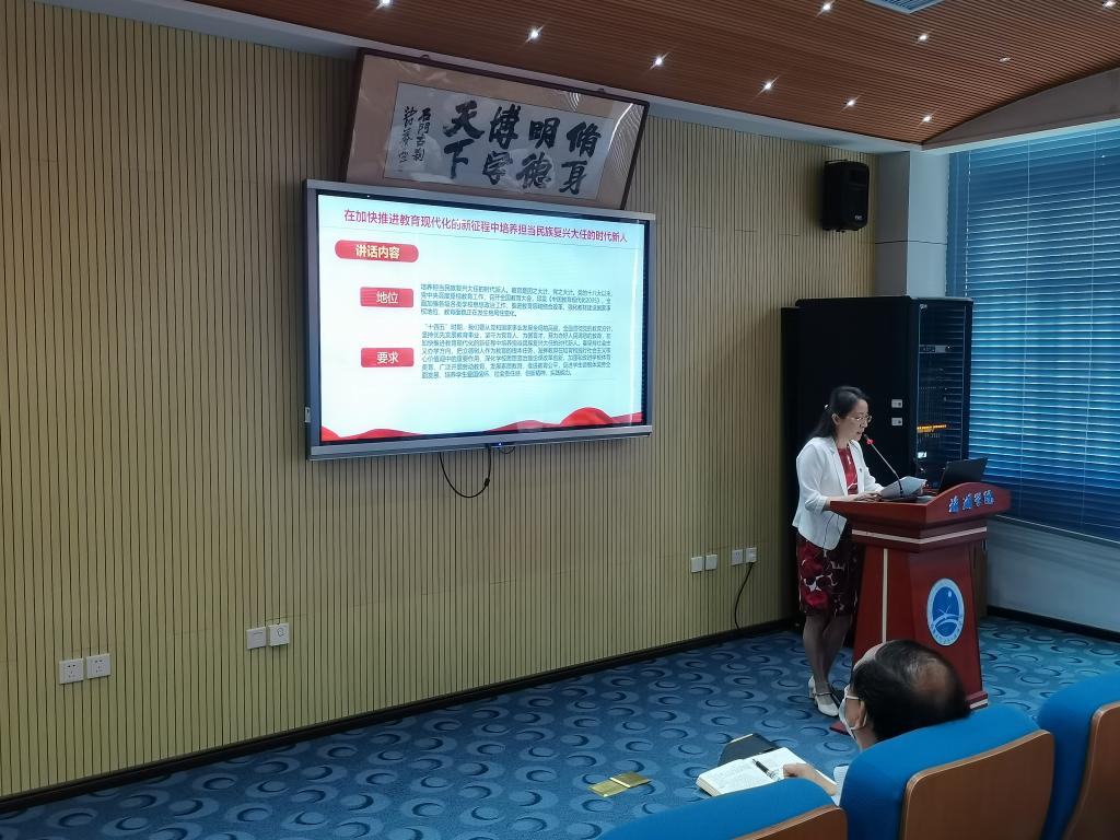 胡蔚涛以“建教育强国 育时代新人”为题,对《习近平谈治国理政》第四卷的内容进行了宣讲和深入解读,倡议全体党员进一步加强学习、找准方向、勇于担当、敢于创新,为祖国发展贡献力量。随后,师生党员与入党积极分子代表深情诵读了《最后的嘱托》《“烽火母爱”赵一曼》等红色家书。全体党员面向鲜红的党旗重温入党誓词,并观看了纪录片《红船故事述初心》。