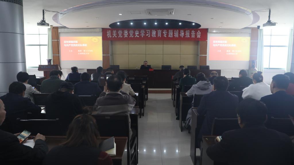 4月16日下午,机关党委在行政楼五楼会议室举行党史学习教育专题报告会,江西师范大学马克思主义学院王员教授应邀作题为《百年辉煌历程与共产党人的无私奉献》专题辅导。机关党委书记朱代洪主持报告会,机关党员120余人参加报告会。